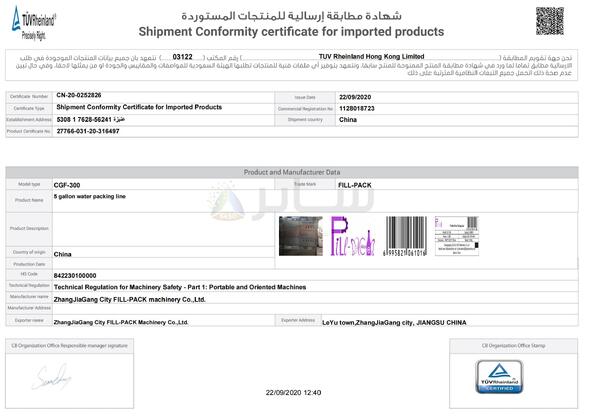 | معيار: | Shipment Conformity certificate |