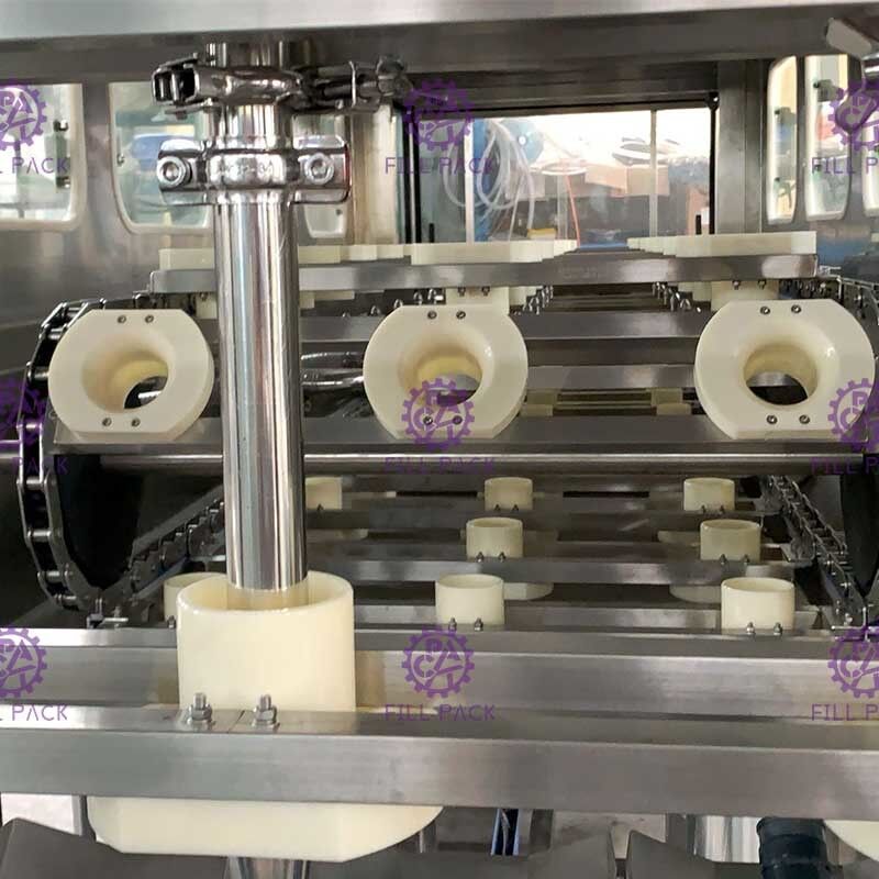 يتم نقل الدلو النظيف بواسطة آلية نقل السلسلة ويسقط على آلية الدلو. ستقوم آلية الدلو بتصحيح الدلو الفارغ، ويتم الضغط على صمام التعبئة، وتبدأ التعبئة. يمكن تعديل وقت التعبئة وفقًا لمعدل تدفق مضخة التعبئة.