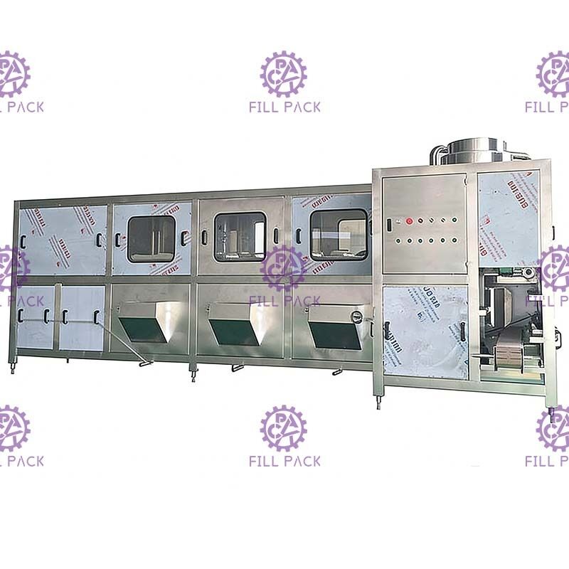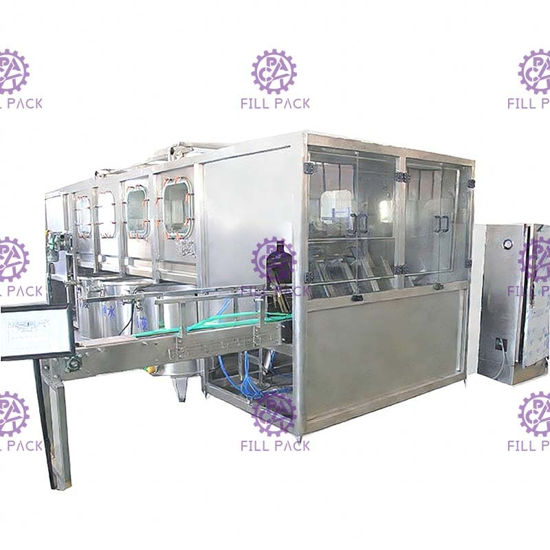 يدخل الزجاجة إلى جزء غسل آلة ثلاثة في واحد من خلال ناقل الهواء.العقدة التي تم تثبيتها على قرص الدوار يلتقط الزجاجة ودوره حول 180 درجة ويجعل وجه عنق الزجاجة الأرضفي منطقة الشطف الخاصة، يرمي الفوهة على العقدة بالماء لشطف الزجاجة داخل الجدار. بعد الشطف والتصريف،تدور الزجاجة 180 درجة على طول السكة الحديدية وتجعل عنق الزجاجة تواجه السماءثم يتم نقل الزجاجة المغسلة إلى جزء التعبئة من خلال إدخال الزجاجة نجمة العجلة. يتم الاحتفاظ بالزجاجة التي تدخل في ملء بواسطة رقبة صفيحة الاحتفاظ.صمام التعبئة التي تعمل من قبل الكاميرا يمكن أن ندرك صعودا وهبوطا. يعتمد على طريقة ملء الضغط. يفتح صمام التعبئة ويبدأ في ملء عندما يتحرك إلى أسفل ويلمس عنق الزجاجة، والصمام التعبئة تتحرك صمام التعبئة إلى الأعلى ويترك عنق الزجاجة عندما ينتهي من ملء,يتم نقل الزجاجة الكاملة إلى جزء الغطاء من خلال عجلة الدفع التحولية.يحافظ على رأس الغطاء المسمار في الثورة والدوران الذاتييمكن أن ينهي دورة تغطية كاملة بما في ذلك القبض، والضغط، ولف، وتفريغ من خلال عمل الكاميرا.يتم نقل الزجاجة الكاملة إلى ناقل منفذ الزجاجة إلى العملية التالية من خلال عجلة إبهام منفذ الزجاجة.