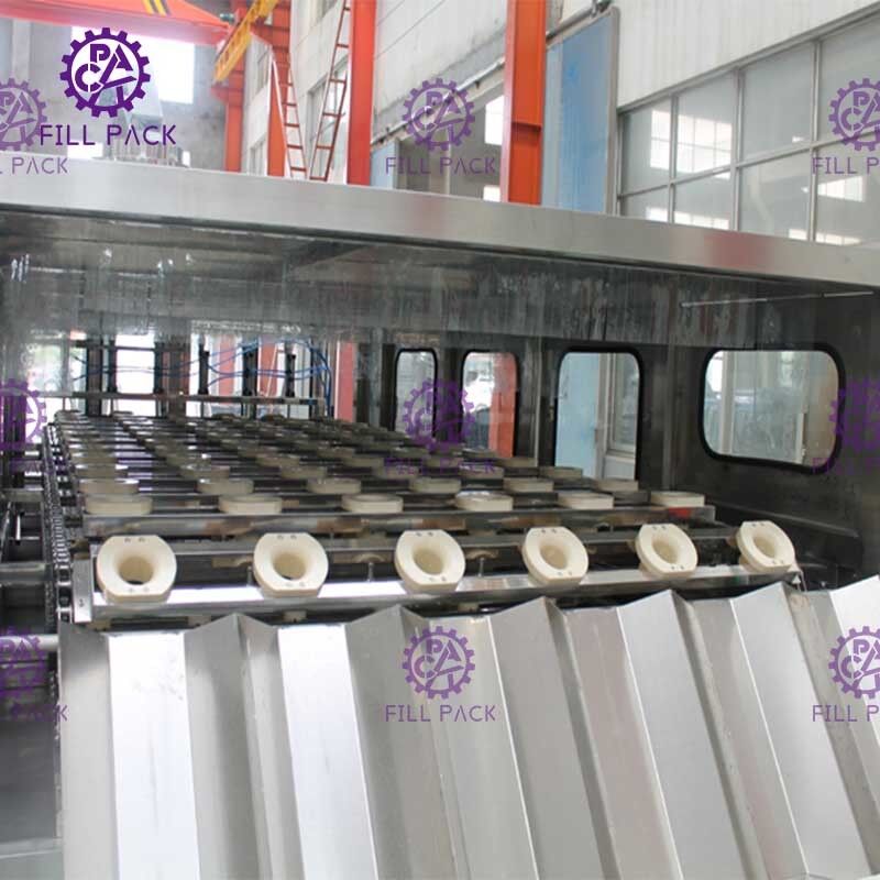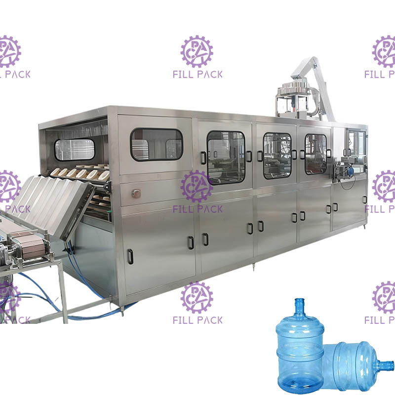 تتحد العملية بأكملها مع 3 آلات ذات وظائف مختلفة في إطار واحد. تحكم عام بواسطة PLC، والعديد من الخلايا الضوئية والعديد من الأسطوانات؛ السعة: 800-900 زجاجة في الساعة - 5 لتر