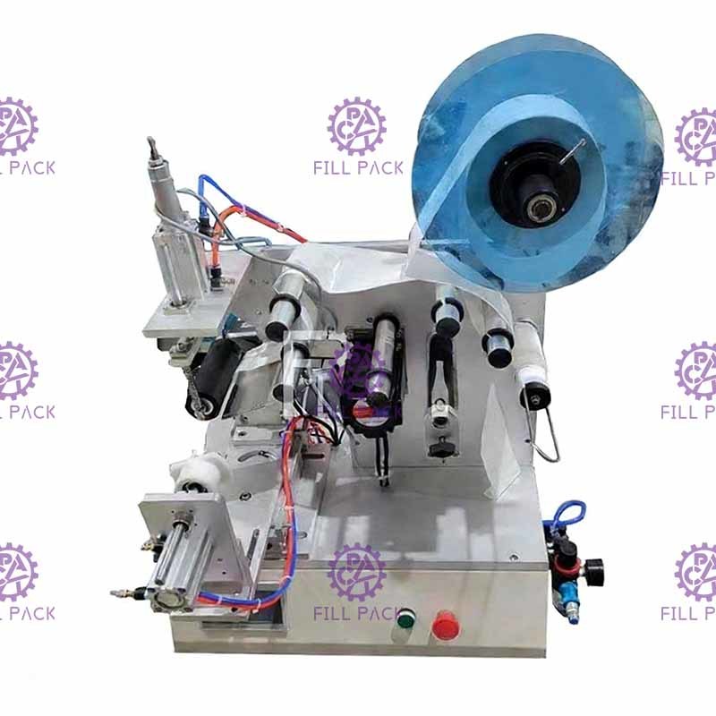المحرك يسحب العلامة، محرك آخر يدفع الزجاجة للدوران، هناك أسطوانة مع عجلة على الآلة، يتم الضغط على الأسطوانة،الزجاجة تدور، يدفع الملصق، ويستكمل التسمية.